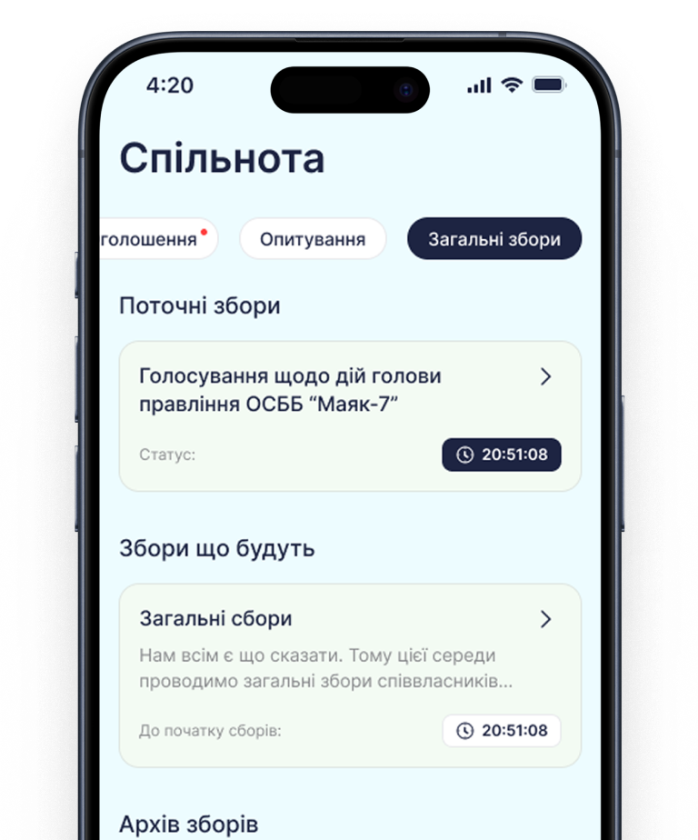 Долучайтеся до загальних зборів просто зі смартфона — голосуйте, обговорюйте та ухвалюйте рішення разом із сусідами